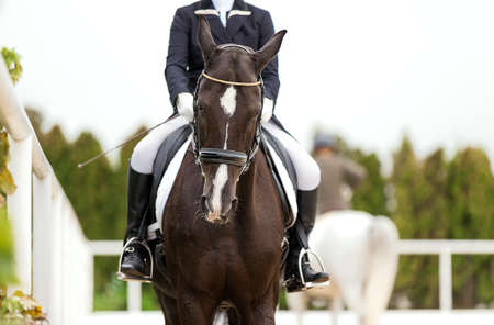 Equestrian sport. Portrait sports stallion in the double bridle. The leg of the rider in the stirrup, riding on a brown horse. Dressage of horses in the arena.