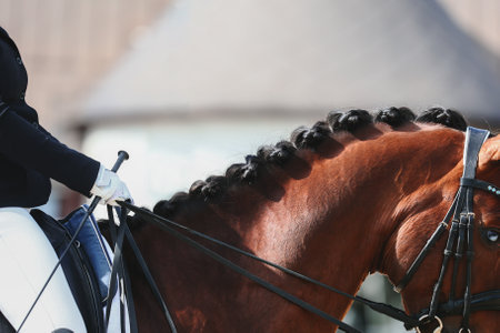 Pigtails on neck sports horse. Horse ears and braided bangs. Equestrian sport. Dressage of horses in the arena. Horseback riding. Not color image.