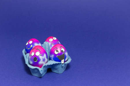 Group of colorful painted Easter eggs with funny cartoon style faces in a light blue egg box on purple background