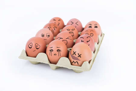 Eggs with funny faces in carton box on wooden table
