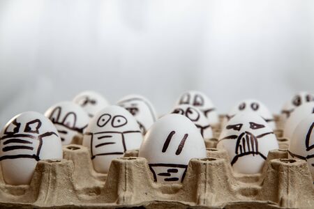 concept of quarantine easter. close up of set of Easter smiled egg surrounded by eggs with drawn medical masks and emotions. copy space