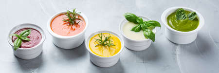 Healthy food, clean eating concept. Variety of colorful seasonal fall vegetables creamy soups with ingredients. Pumpkin, broccoli, carrot, beetroot, potato, tomato spinach. Banner