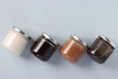 Vegan organic paste of flax seeds, milk thistle, peanuts and coconut in glass jars on light blue background, urbech. Healthy food product. View from above