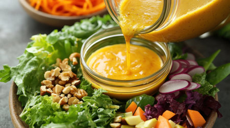 A vibrant salad featuring an array of fresh vegetables, nuts, and a creamy dressing being poured, perfect for healthy meal preparation.