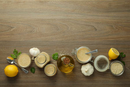 Concept of tasty food with tahini sauce on wooden background