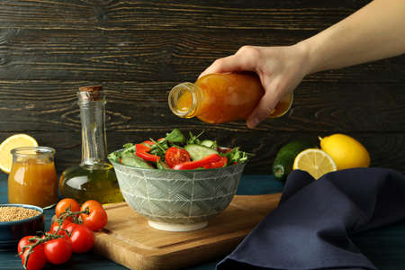 Female hand pour honey mustard sauce on salad
