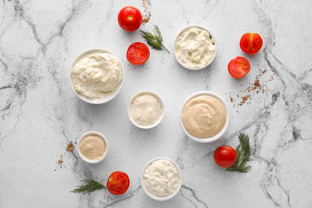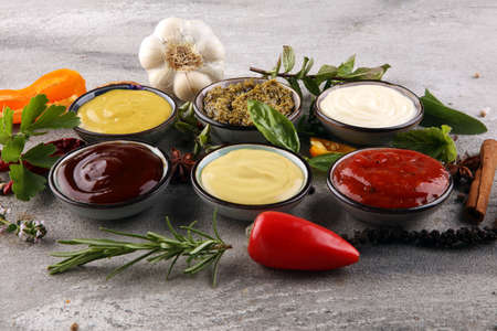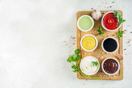 Set of classic sauces on white stone concrete stone background.
