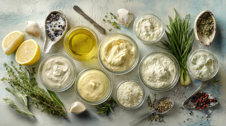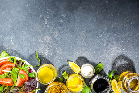 Set of dressings for salad: sauce vinaigrette, mustard, mayonnaise or ranch, balsamic or soy, basil with yogurt. Dark white concrete table. Copy space top view
