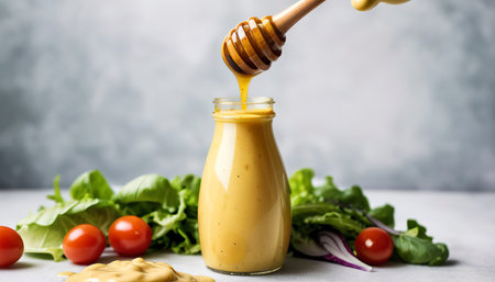 Homemade honey mustard salad dressing in glass bottle