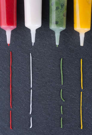Tubes colored icing on a slate blackboard
