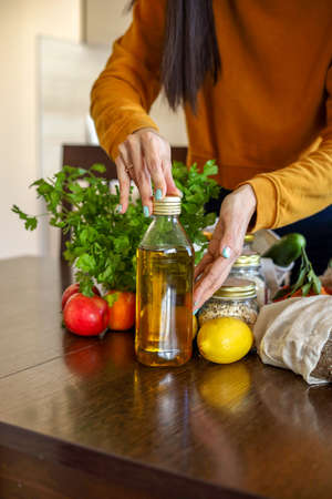 Young Asian woman takes out an olive oil from a grocery bag. Reusable package. Zero waste. Vegetarian woman. Conscious consumption.