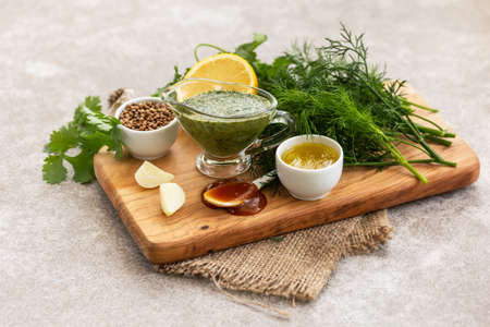 Green sweet and sour homemade sauce with ingredients on the wooden background. Horizontal view. Copyspace