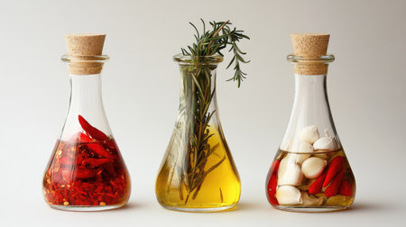 Studio photo of three glass bottles with olive oil. One bottle is filled to the top and has rosemary herbs hanging from it. The second narrow-bottomed jar contains red peppers. The third wide-bottomed container holds garlic. All against a white background, with food photography, product shot, natural lighting, and high resolution. --chaos 30 --ar 16:9 --v 6.1 Job ID: 8cb38ac9-976d-4db7-9c3c-e118e7deead6