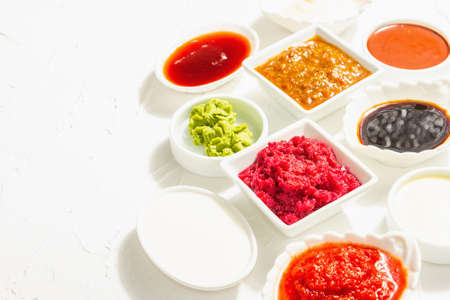 Set of different sauces - ketchup, mayonnaise, barbecue, soy, chutney, wasabi, adjika, horseradish, aioli, marinara. Trendy hard light, dark shadow. White putty background, copy space