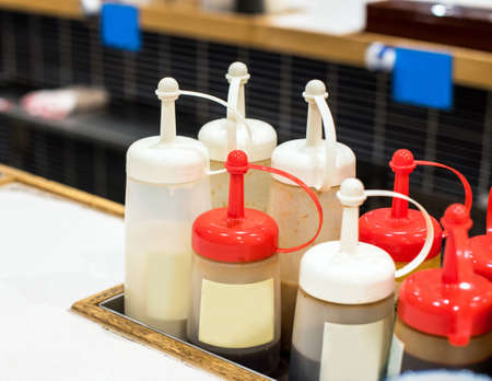 Bottles for sauces in a local cafe, Tokyo, Japan. Close-up