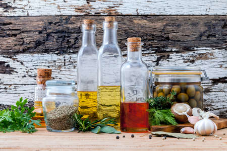 Different sorts of cooking oil,olive oil flavored and Sesame oil with spices herb rosemary ,thyme,dill,sage and parsley set up with old wooden background.