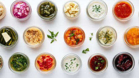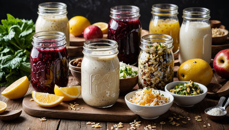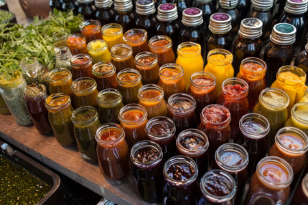 Discover a vibrant collection of sauces, dressings, and pickled vegetables in jars, perfect for enhancing culinary delights and showcasing food creativity in kitchens and events.