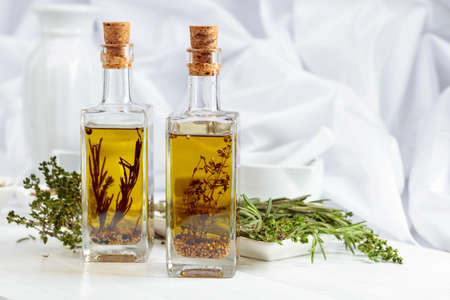 Bottles of olive oil with spices and herbs on a white wooden table.
