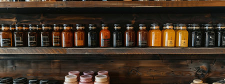 A row of neatly arranged beauty products and oils in glass bottles displayed on rustic wooden shelves. The natural materials and earthy tones create a warm, organic aesthetic in the store.