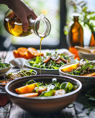 An image capturing the preparation of a vibrant citrus salad. Golden olive oil is drizzled from a glass bottle onto fresh greens and citrus fruits, creating a healthy and delicious culinary experience.