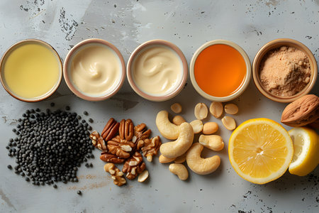 A variety of nuts and seeds including pecans, walnuts, cashews, and black sesame, displayed with spreads of different consistencies and colors, alongside a halved lemon. ideal for promoting healthy eating and natural ingredients. Generative AI