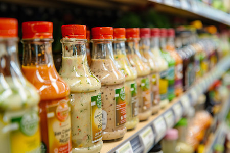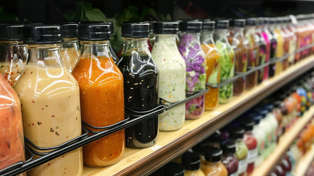 Variety of Salad Dressings on Grocery Store Shelf for Healthy Eating.