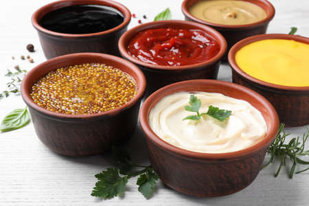 Many different sauces and herbs on white wooden table, closeup