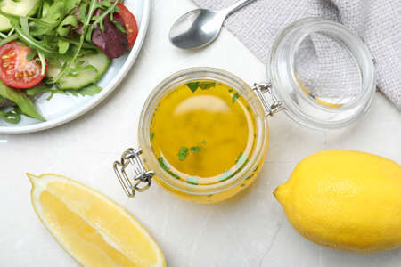 Jar with lemon dressing near salad on light table, flat lay