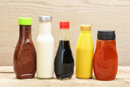 different sauces on wooden background