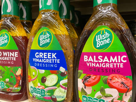 Grovetown, Ga USA - 03 09 22: Retail store Wishbone Salad dressing variety and shelf tags
