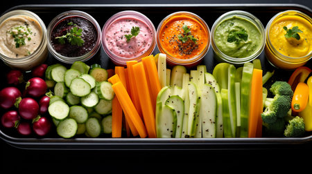 A photo of a colorful array of vegetable crudites with dip in a snack container