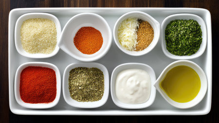 A stunning display of various sauces and spices in small bowls, beautifully arranged on a wooden tray. Perfect for showcasing culinary creativity and flavors in food photography.