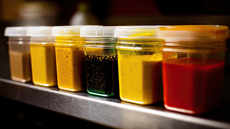 A vibrant collection of sauces in clear containers arranged on a stainless steel surface, showcasing a variety of flavors ideal for culinary use in kitchens.