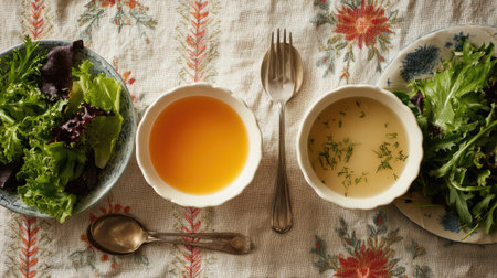 Fresh and healthy salad featuring a variety of colorful greens and a light soup, served on a floral tablecloth. Ideal for nutritious meals.