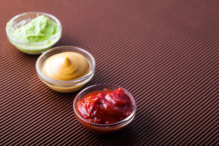 adjika,mustard,wasabi in a glass bowl on a brown background