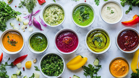Explore the vibrant array of fresh dips and sauces made from herbs and vegetables, perfect for enhancing any meal with flavor and color.