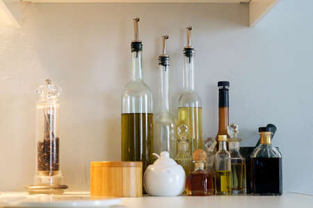 A collection of oil bottles for cooking fills a shelf with pepper mill and jars on kitchen counter.