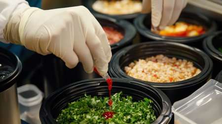 A chef in white gloves skillfully drizzles red sauce over freshly chopped herbs, showcasing vibrant ingredients in a modern kitchen, emphasizing culinary craftsmanship.