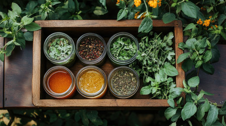 A beautiful arrangement of fresh herbs and spices in glass jars within a wooden box, complemented by lush greenery and bright flowers, perfect for culinary inspiration.