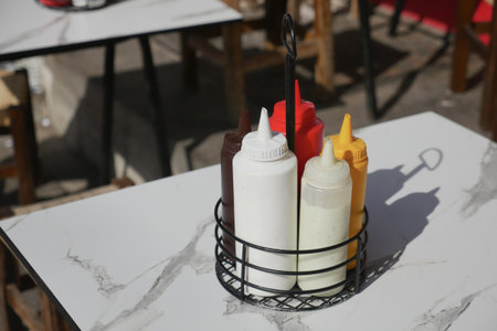 Various condiments on a restaurant table in sunlight