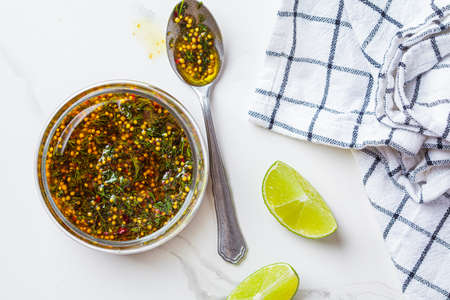 Mustard, olive oil and dill salad dressing in a glass jar, top view. Cooking healthy food concept.