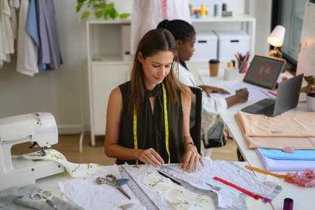 Woman tailor working on a clothing sewing stitching measuring fa