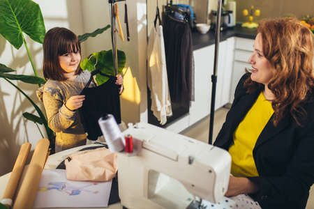 Cheerful young woman sewing with her daughter. She working at home.