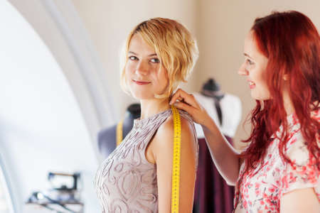 Pretty dressmaker at work making measures of client