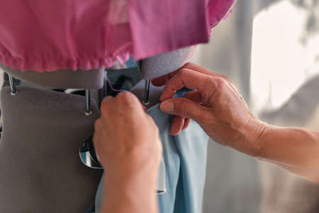 adult hands of a seamstress fitting a garment correctly on a mannequin