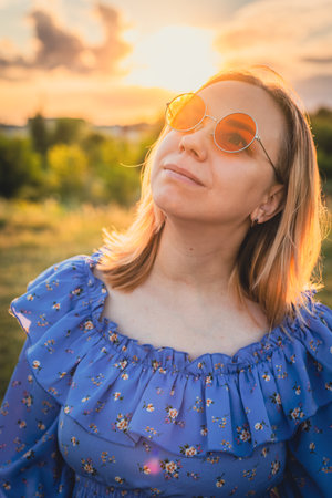 Woman in Blue Floral Dress and Round Sunglasses Enjoying Sunset in Open Field.