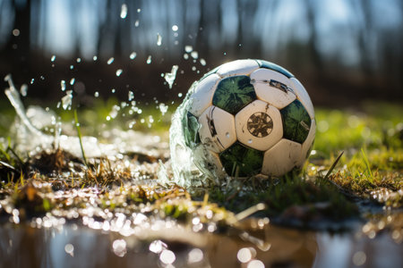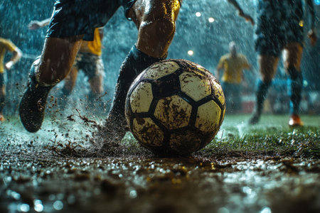 A player kicks a wet soccer ball through puddles during a rain-soaked match on a muddy field in the afternoon. Generative AI
