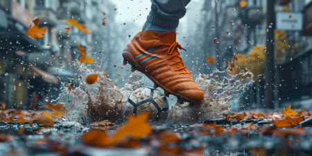A close-up scene capturing the intense moment of a soccer player kicking a muddy football, creating a spectacular splash of water in a rainy outdoor setting, showcasing athleticism.