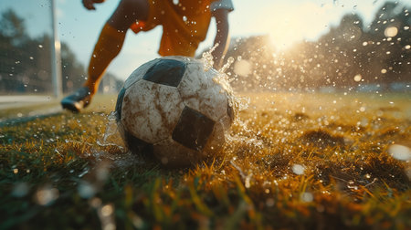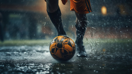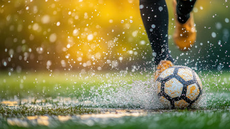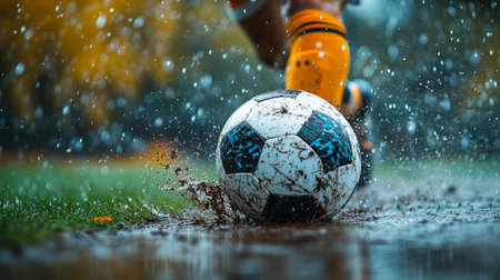 A player kicks a soccer ball through a rain-soaked field during an afternoon match in a vibrant, wet environment. Generative AI