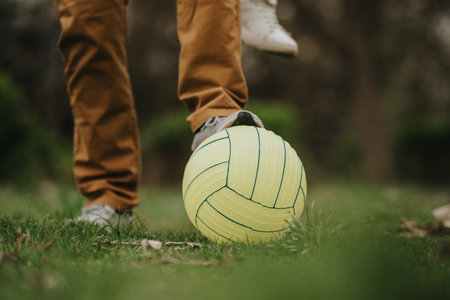 player playing soccer with ball, close up of foot and ball on green grass, by ai generative